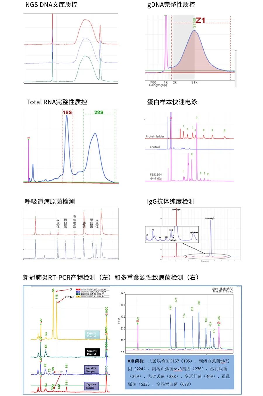 · 普通PCR产物、高分辨率多重PCR 产物检测(多重病原菌检测、呼吸道病毒检测、致泻性大肠埃希氏菌检测、结核分枝杆菌VNTR分型、SSR/STR分子标记等)